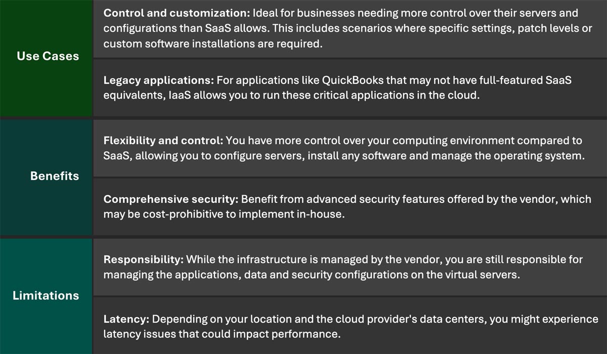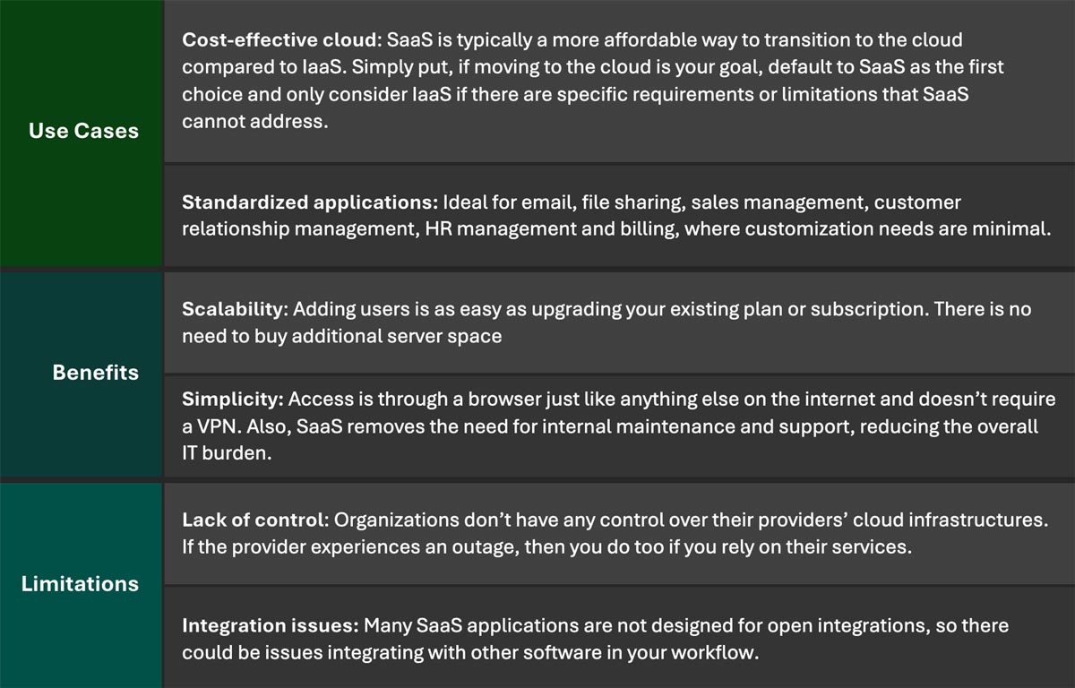 Ultimately, IaaS offers more control, but SaaS offers easy access and less responsibility. Each also comes with limitations, so it’s important to speak with your IT team or managed service provider about the pros and cons of each solution.