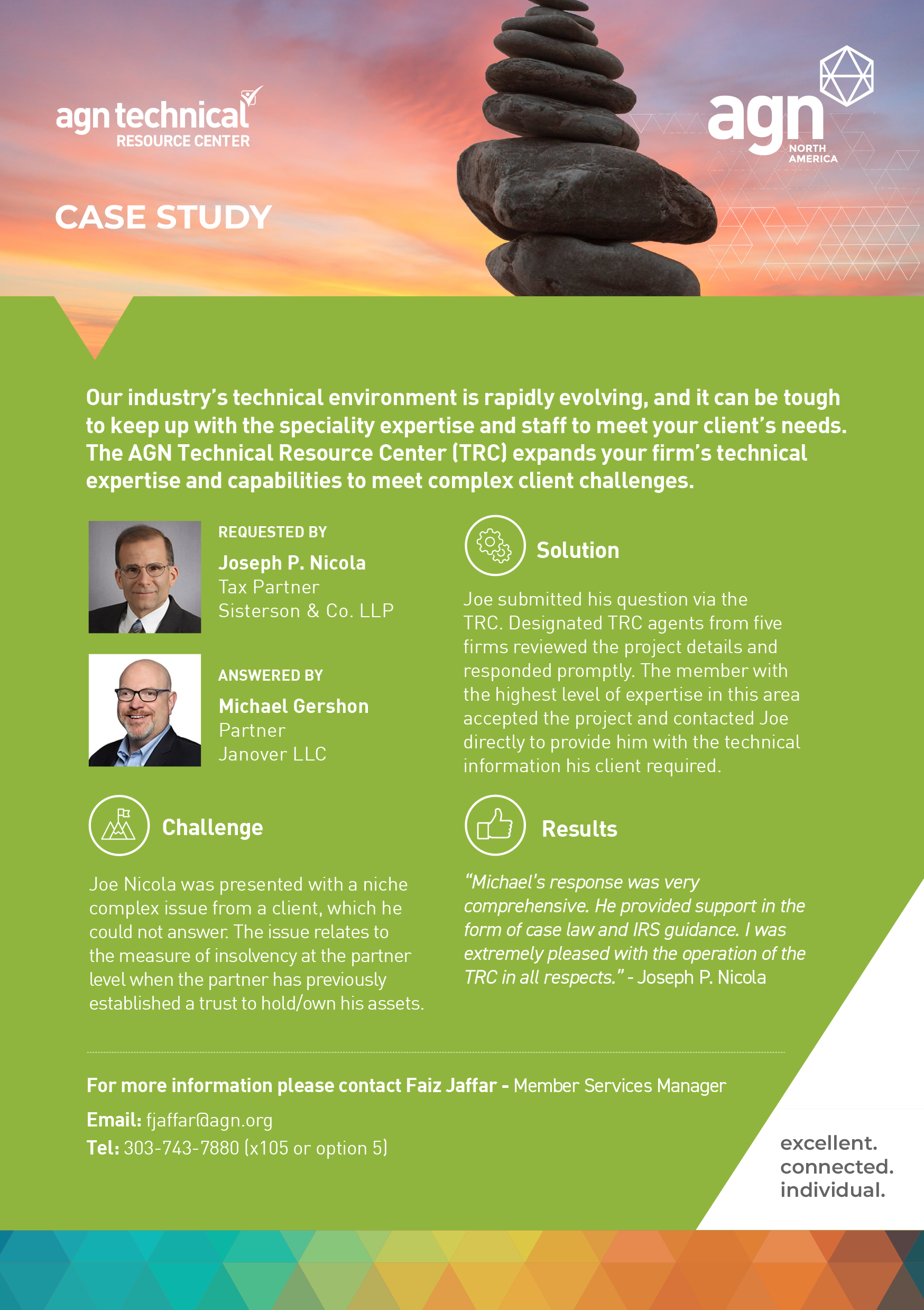 Our industry’s technical environment is rapidly evolving, and it can be tough to keep up with the speciality expertise and staff to meet your client’s needs. The AGN Technical Resource Center (TRC) expands your firm’s technical expertise and capabilities to meet complex client challenges.